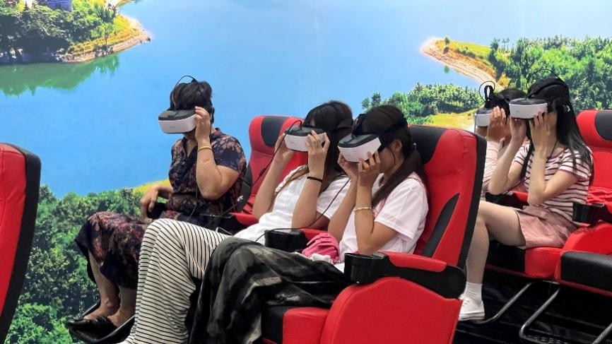 图中队员们戴上VR眼镜感受淌水崖水库的壮观