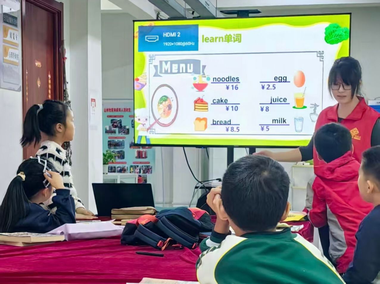 与此同时,三年级的课程由唐悦辰同学稳步推进。她首先带领孩子们复习了上一单元的重点知识,通过提问和快速应答的方式,帮助大家温故知新。在确保孩子们掌握扎实后,她才开始讲解新内容,条理清晰,逻辑严谨。孩子们也十分配合,认真听讲,不时点头示意,遇到不懂的地方也会主动举手提问,展现出了良好的学习态度。