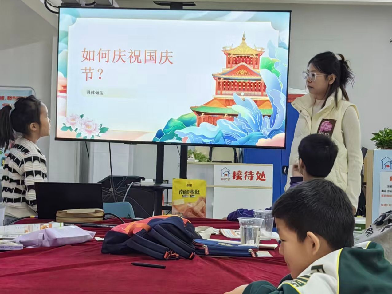 “跟我念——天安门!”初昕昱双手比出城门的形状。同学们立刻跟着模仿,声音洪亮又整齐。鲜艳的国旗、庄严的国歌,孩子们一边比出敬礼的姿势、跟着节奏轻晃身体,一边齐声诵读关键词,欢呼声和讲解声交融成热闹的节日氛围。