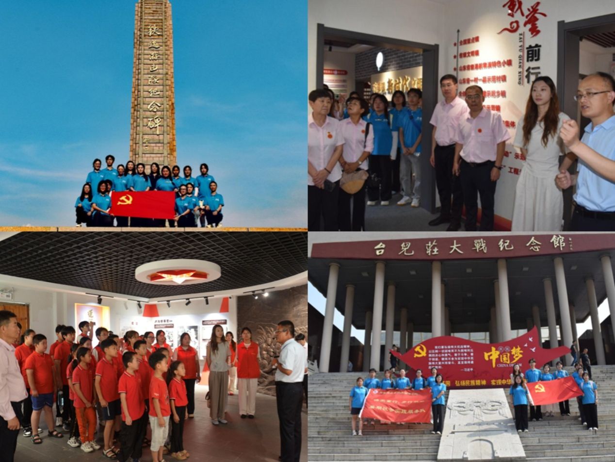 实践队以红色教育为主线,先后走进铁道游击队纪念馆、枣庄胜利渠教育基地、白楼湾红色教育基地和台儿庄大战纪念馆,通过实地参观、专题访谈、情景体验等形式,深入学习革命历史,感悟红色精神。7月8日,在铁道游击队纪念馆,锈迹斑斑的土琵琶和复原的微山湖秘营场景让队员们深切感受到革命先烈的英勇无畏,在英烈纪念碑前,全体成员默哀致敬,齐唱《弹起我心爱的土琵琶》,用歌声传递传承红色基因的决心;7月9日,在胜利渠教育基地,程庄村党支部书记渠志强为队员们上了一堂生动的思政课,深刻阐释了自力更生、艰苦奋斗的胜利渠精神;7月10日,在白楼湾红色教育基地,实践队队员与孤困留守儿童共同聆听运河支队的抗战故事,从“最后一粒粮做军粮”的奉献精神中汲取奋进力量;7月11日在台儿庄大战纪念馆,泛黄的家书和战地照片让“团结御侮、血战到底”的战役精神深深烙印在队员们心中。在重走红色足迹的过程中,实践队员还通过直播、短视频等新媒体手段传播红色故事,这不仅强化了队员们的理想信念,也为传承红色基因注入了青春活力。