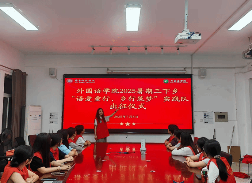 7月5日,出征仪式在二教B216教室举行。团队指导老师吴昊强调“三下乡”是青年扎根基层、结合专业服务社会的重要契机,鼓励队员以外语专业优势助力乡村教育,并着重叮嘱安全纪律,包括交通、饮食、防暑、防溺水等注意事项。出征前,队员们精心整理课外图书等物资,每一本书都承载着对乡村孤困留守儿童的期待。这些物资不仅是知识的载体,更搭建起助力乡村教育的 “物质桥梁”,为实践活动奠定坚实基础。