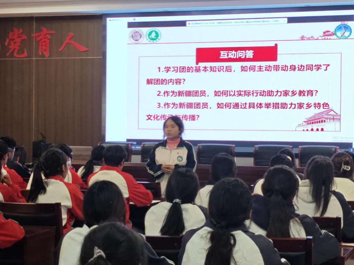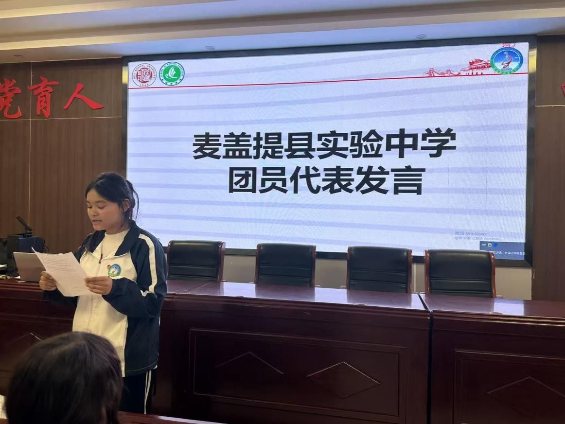 在交流分享环节,麦盖提县实验中学的团员代表们结合家乡的发展变化,纷纷敞开心扉,分享了自己的感悟与心声。“跟党走,不仅仅是一句口号,它体现在家乡通电通路时乡亲们的喜悦笑容中,体现在老师们扎根新疆、教书育人的无私奉献里。”一位团员的发言质朴而真挚,引起了在场所有人的共鸣。另一位团员则满怀激情地表示,作为新时代的边疆青年,要以胡杨精神为指引,将根深深扎在祖国边疆的土地上 ,用所学知识为家乡的建设贡献自己的力量。