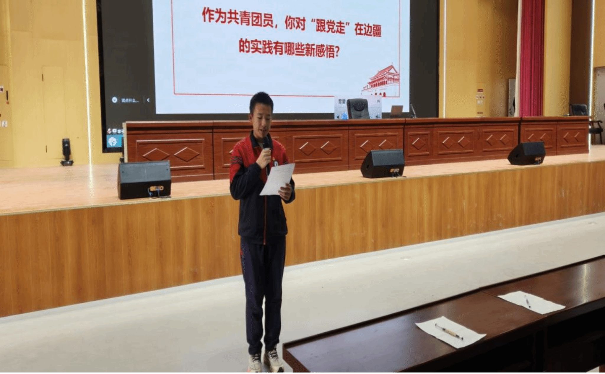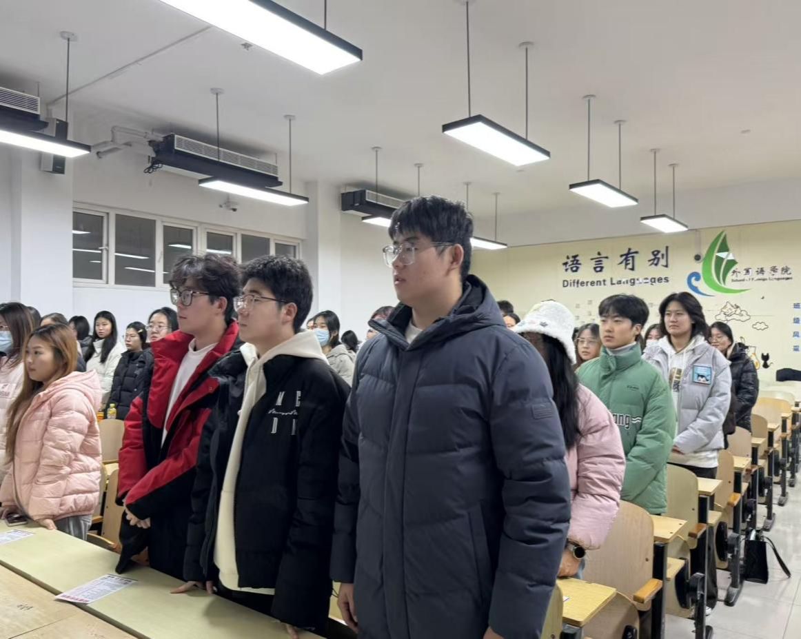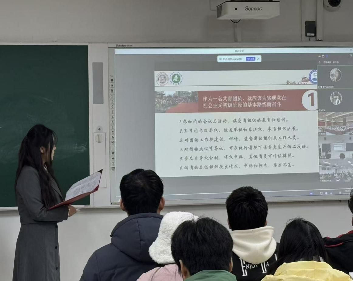 团课以一部展现新疆教育发展与支教风采的专题视频拉开帷幕,鲜活影像令同学们深切感受到了边疆教育上的脉动与支教者的奉献精神。互动环节中,新疆学子围绕“‘跟党走、在边疆’的实践感悟”分享体会,将个人成长与边疆发展紧密相连,展现了新时代青年的责任与担当。随后,主持人围绕共青团核心知识进行了深入浅出的讲解,为团员们夯实了理论基础。全体同学共唱团歌《光荣啊!中国共青团》,激昂的旋律将现场氛围推向了高潮。
