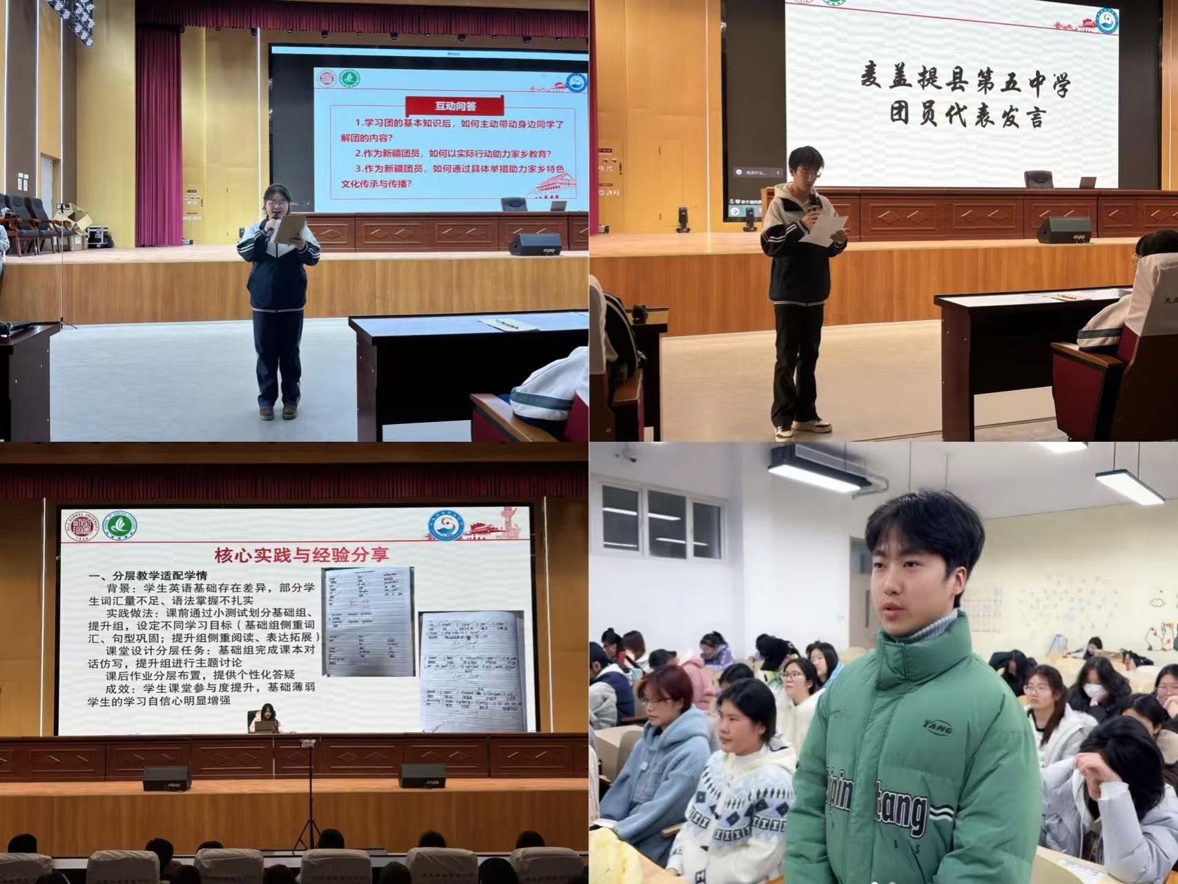 第二轮互动中,新疆学生就“带动身边同学了解团知识”、“助力家乡教育实践”、“推动家乡特色文化传承传播”等议题依次发言,他们的回答充满了对家乡的热爱与思考并展现了服务桑梓的坚定决心。随后,麦盖提县第五中学的团员分享了帮扶案例,我院英语师范专业支教团员则分享了宝贵的教学经验,生动阐释了师范生如何将专业学识转化为教学实践,为即将踏上支教征程的同学们提供了宝贵的教学参考与方法启迪。最后,2024级团员代表明确表示,他们将持续精进专业素养,矢志以学识才干为边疆教育贡献力量。