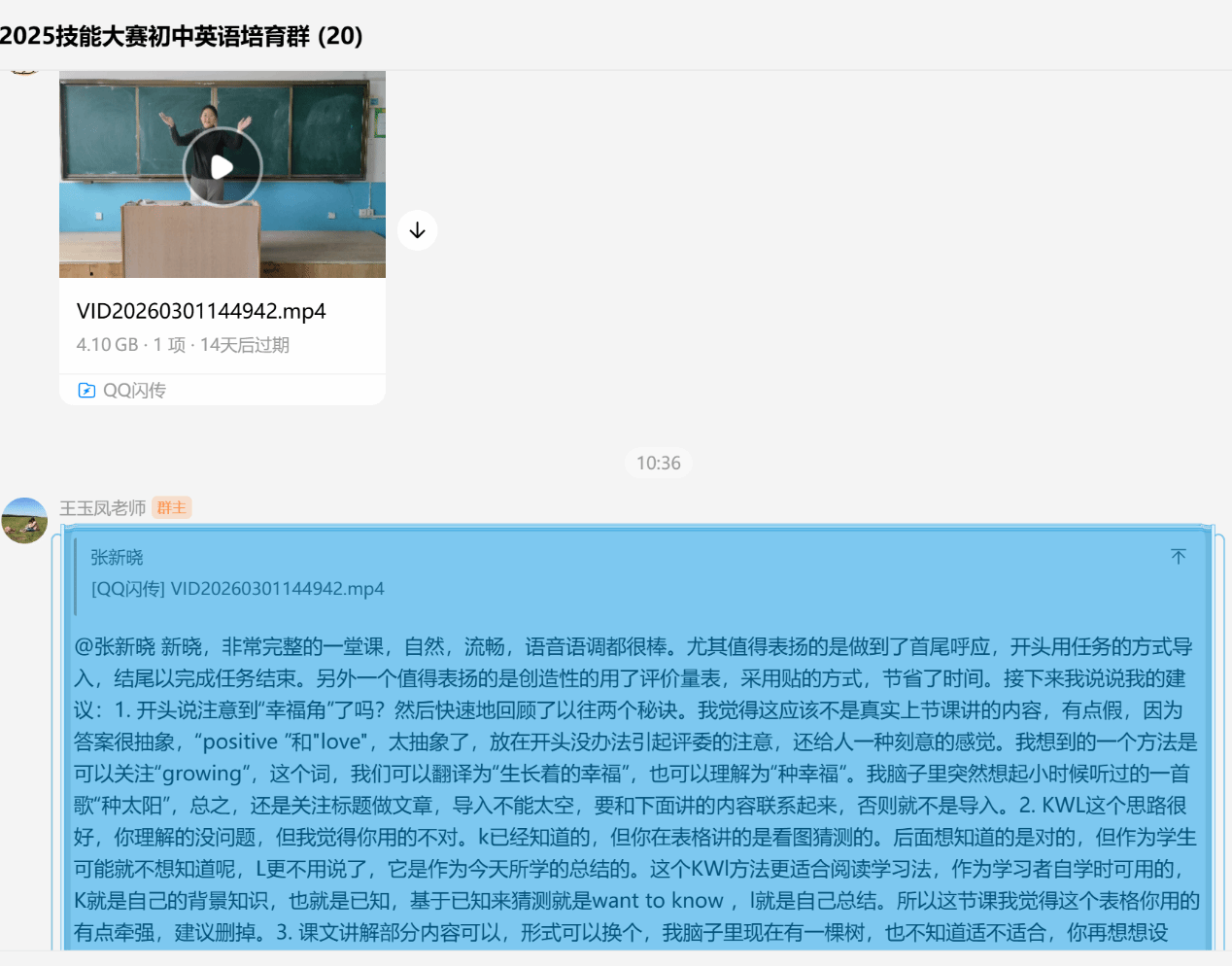 初中组自1月19日起开展五周专项训练,涵盖语音语调、课堂用语与教姿教态、板书设计、答辩技巧、完整授课流程五大模块。选手每周提交训练视频,指导教师逐份点评、逐项整改。王玉凤老师针对张新晓试讲视频指出,课堂应做到首尾呼应、善用评价量表,导入要紧扣标题、避免流于形式,为选手提供了具体改进方向。后续将持续深化授课打磨,组织线上模拟比赛,同步挖掘培养一专多能型选手。