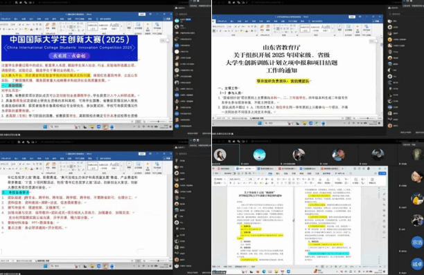 寒假前夕,学院组织创新创业赛事线下专题分享会,邀请往届优秀师生代表解读赛事规则,传授商业计划书撰写与路演答辩技巧。寒假期间,双创团队与指导教师通过线上会议、一对一沟通等方式,协助学生团队完成国创、大创、三创、挑战杯等四大赛事报名,做到“应报尽报”。针对项目申报书、商业计划书等关键材料,从内容逻辑、数据支撑到亮点提炼,开展多轮精细化修改与提升指导。1月20日,学院召开四大赛事线上推进会,学院领导、指导教师及学生代表共同参会,逐项梳理进展、明确优化方向与材料提交节点,推动项目质量持续提升。