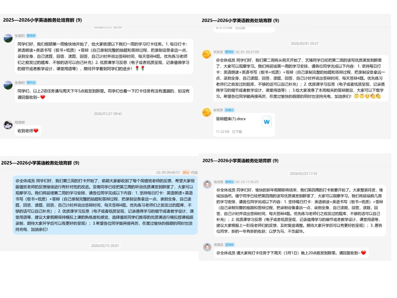 小学组严格执行五周递进式训练计划,由张晨阳、李笑笑、何璇、常高歌等教师分模块指导,通过“周作业+一对一反馈”机制,确保训练全覆盖。着力培养一专多能型选手,邴鑫柳、陈煊泽将参与小学语文线上试讲,拓展跨学科教学能力。开学后将择优推荐3人参加校赛,聚焦线下授课与答辩实战强化。