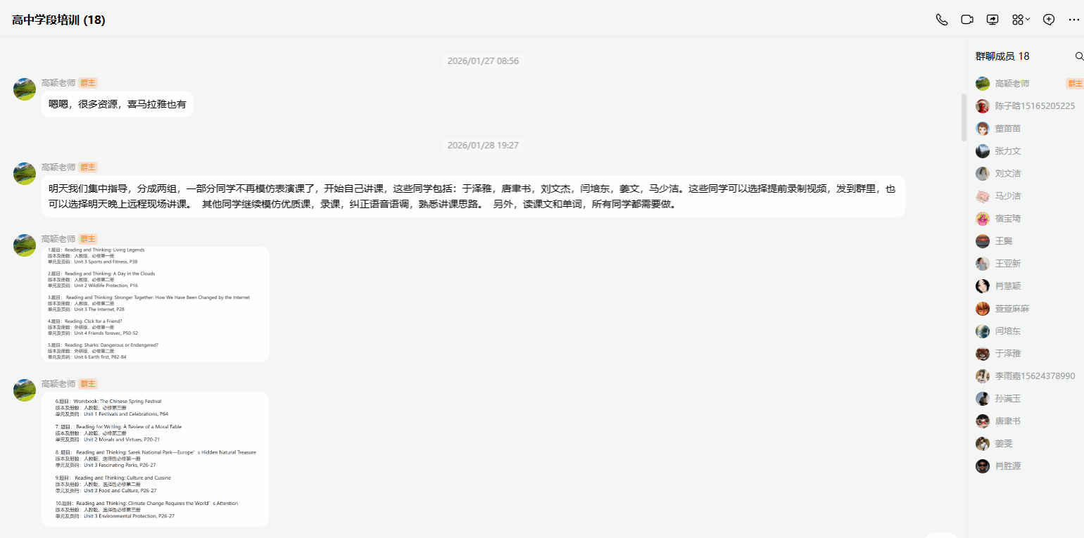 高中组实行梯队化精准指导:第一梯队6人由张力文、高颖老师线上集中点评;第二梯队4人由李妍老师一对一专项补差。1月28日晚通过腾讯会议对重点学生进行备赛指导,明确模仿优质课与自主讲课相结合的训练路径。开学后将采用线上+线下相结合模式,对重点培养对象实行三位指导教师每周不少于三次线下集中强化指导,确保备赛工作高强度、高质量推进。
