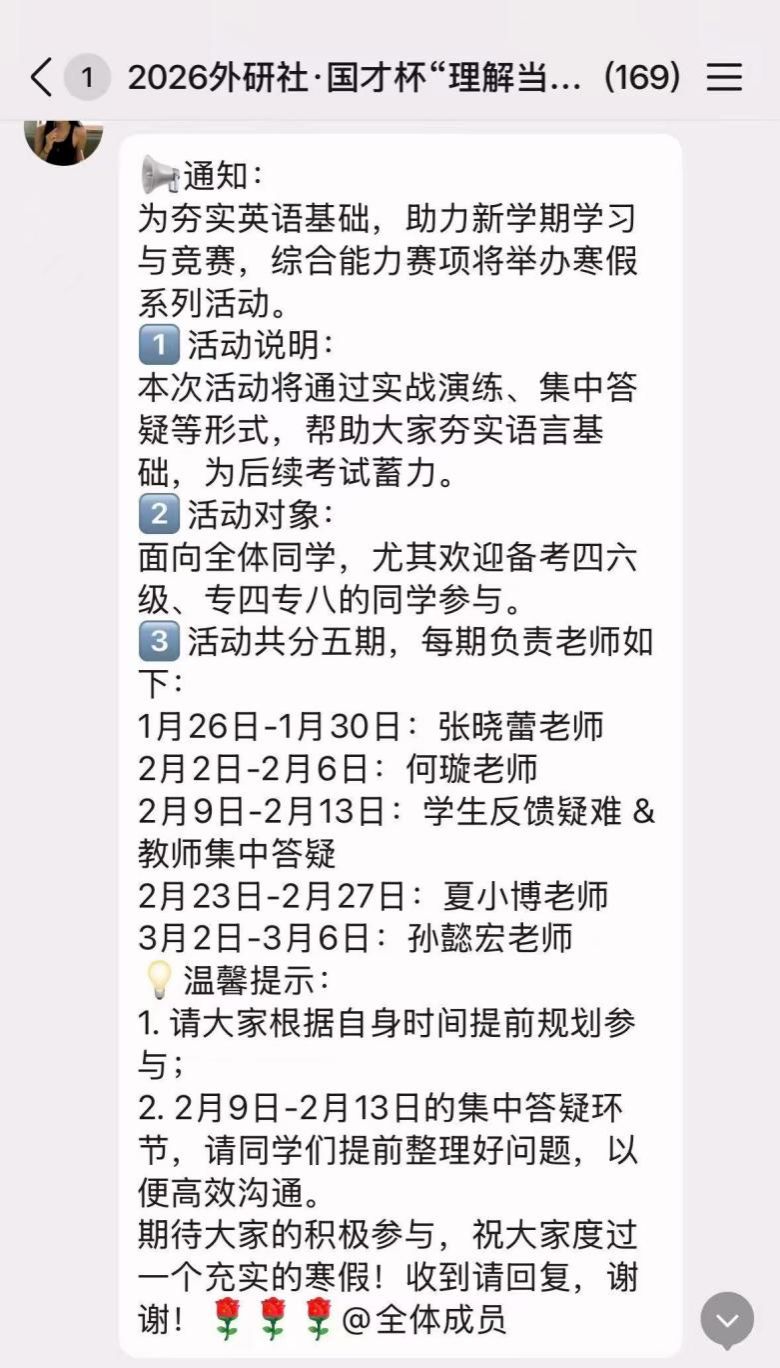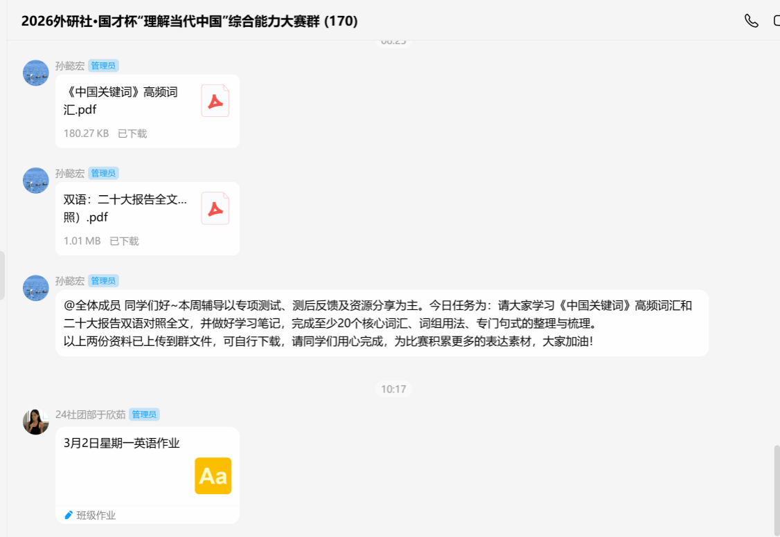 围绕“外研社·国才杯”“理解当代中国”全国大学生外语能力大赛的综合能力、演讲、笔译等赛事模块,学院构建“基础夯实—专项提升—实战演练”一体化培育体系,以五期递进式活动为抓手,全面提升学生语言应用与跨文化传播能力。综合能力赛项聚焦语言基础与思辨能力,通过词汇语法夯实、阅读写作强化、集中答疑反馈、专项测评、实战模拟,五期内容系统训练,结合《中国关键词》《二十大报告双语对照》等权威素材,引导学生积累时政表达、深化主题理解;演讲赛事以“理解当代中国”为主线,通过主题素材积累、逻辑框架构建与表达技巧优化,强化“讲好中国故事”的内容深度与情感温度;笔译赛事则聚焦时政与文学翻译,开展“每日一练+周复盘”训练,精选权威文本进行双语转换实践,同步整理核心术语与翻译策略,提升译文准确性与专业性。通过资源精准供给与常态化反馈指导,为新学期赛事储备了扎实的语言功底与实战能力。