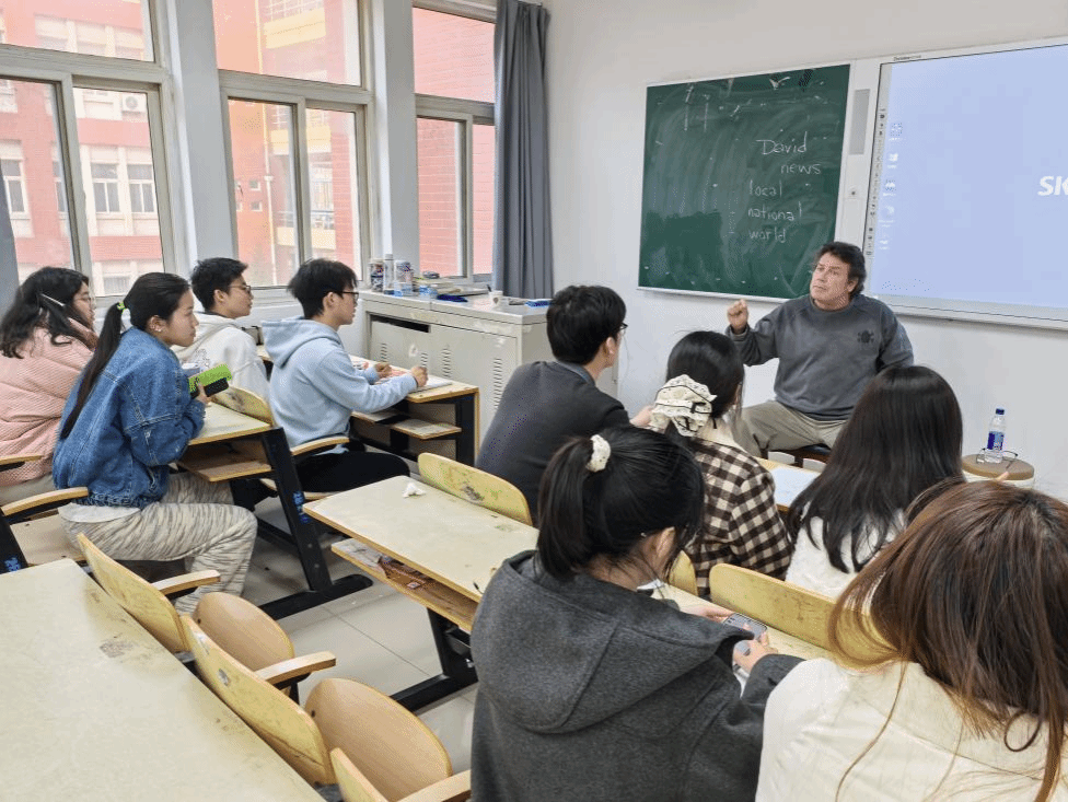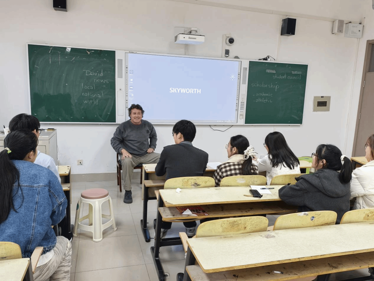 课程伊始,David Dee老师以生动幽默的教学风格快速点燃课堂氛围,紧扣新学期主题切入交流话题。他在黑板上清晰罗列“academic(学术的)”“scholarship(奖学金)”“athletics(体育运动)”等高频实用词汇,又以新闻热点、音乐歌手、校园赛事等贴近学生生活的内容为抓手,引导大家大胆开口、自由分享。同学们围绕日常兴趣与校园生活各抒己见,或畅谈喜爱的歌手与作品,或回味校园运动会的精彩瞬间,或结合热点新闻表达个人见解,全程以英语交流互动,在表达中锻炼口语能力,在分享中积累常用词汇。