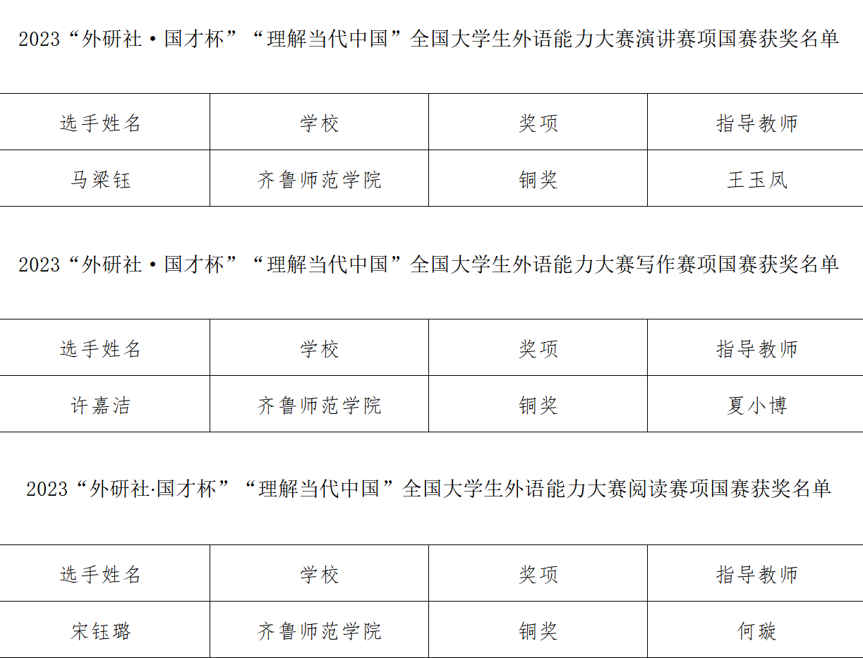 12月5日,2023“外研社·国才杯”“理解当代中国”全国大学生外语能力大赛(英语组)国赛各分赛赛事圆满落幕,我校yl6809永利官网集团学生马梁钰、许嘉洁、宋钰璐与来自全国各大高校近2000名选手同台竞技,分别斩获英语演讲赛项国赛铜奖1项、写作赛项国赛铜奖1项、阅读赛项国赛铜奖1项的历史好成绩,三位选手在代表学校实现首次闯入该类赛事国赛后,又一举拿下其中三类竞赛奖项,实现学校在该类竞赛的历史性突破。