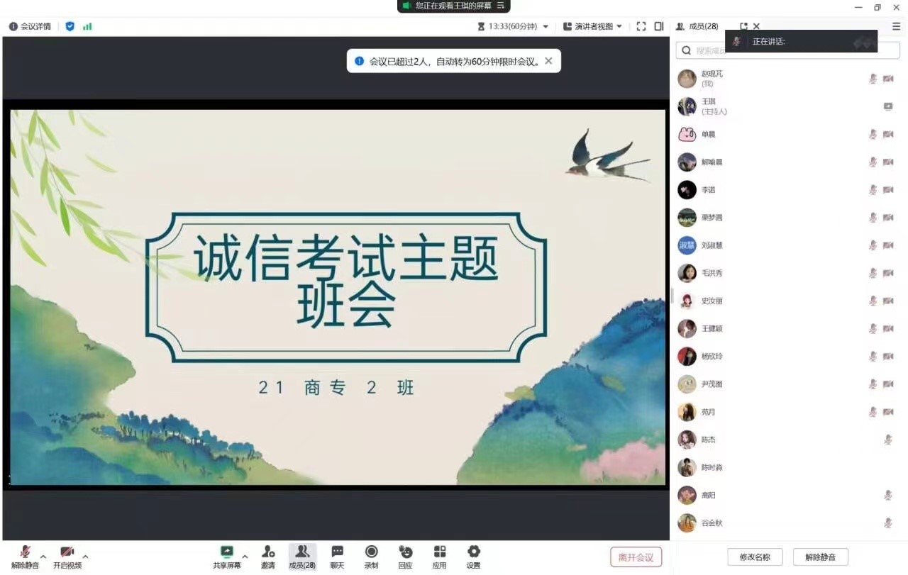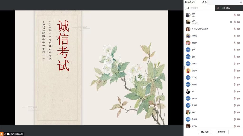 为进一步提高大学生诚信考试意识,确保2024年专升本考试有序开展,保证考试公平公正。3月27日,yl6809永利官网集团2021级商务英语专科班召开线上诚信考试主题班会。会议由各班班长主持,全体专升本考生参加。