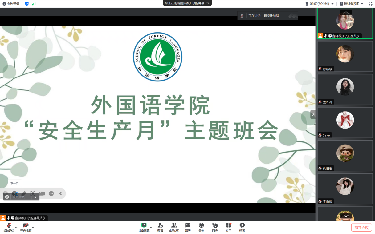 安全生产月主题班会是学院加强安全教育的重要组成部分,本次主题班会主要包含防溺水安全知识、宿舍用电安全、长假安全教育(饮食安全和财产安全)三方面。会议伊始,各班班委通过生动的案例分析和互动讲解使同学们了解防溺水的基本知识和紧急救援技巧。接着,针对宿舍用电安全指出了常见隐患,并提供了一系列预防措施,如正确使用电器、定期检查电线等。此外,会上班委对于如何鉴别健康食品、避免食物中毒等问题也进行了详细讲解。