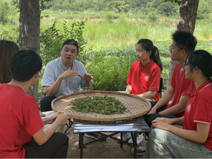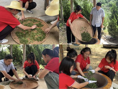 采摘之后首先需要晾青,而后则是炒青,将茶叶放入铁锅中不断翻炒使茶叶变得柔软且有韧性,以高温炒青破坏叶中酵素活性,进一步除去鲜叶中的臭青味。在炒青过程中,温度极高,人工翻转极其需要技巧和练习,队员们在炒茶师傅的指导下进行,不惧高温,虚心求教。炒完的茶叶往往在还冒着热气,带着茶香的情况下就要进入下一道工序——揉青。将炒青后的茶叶放于竹编,进行手工揉捻,使其滚动并呈卷曲状,队员们虽不熟练,但细致负责,坚持不懈,力求最好。揉捻后的茶叶需要进行晒青,在太阳光下自然晒干最大程度地保留了茶叶的活性物质,由于时间原因选择了机器烘干,即将茶叶重新倒入铁锅中继续翻炒,将水分炒干,此时便完成了绿茶的制作。最后将烘干后的茶叶进行冷却、压实并装袋,这样一份精美的茶叶便完成了。同学们在茶园里体验了制茶全过程,观其色、闻其香、品其味、悟其韵!