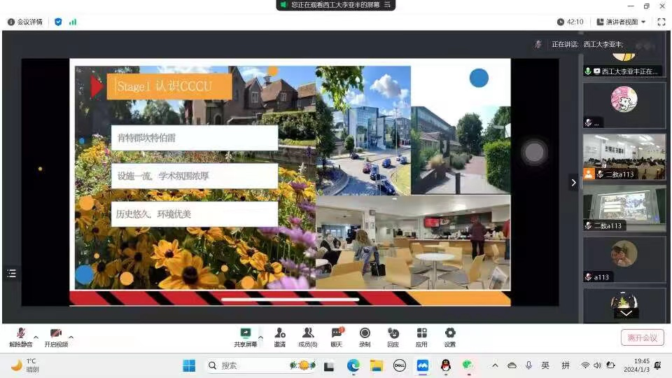 会中,西工大坎特伯雷大学留学生连线讲述了自身留学经历,他表示留学可以体会到国外独特的学术设计、浓厚的学术氛围、悠久的历史文化、多样化的课程。宋秀葵院长最后总结,鼓励大家积极了解与英国坎特伯雷大学出国项目的相关事项,找准自身发展方向,为今后留学或就业做好准备。