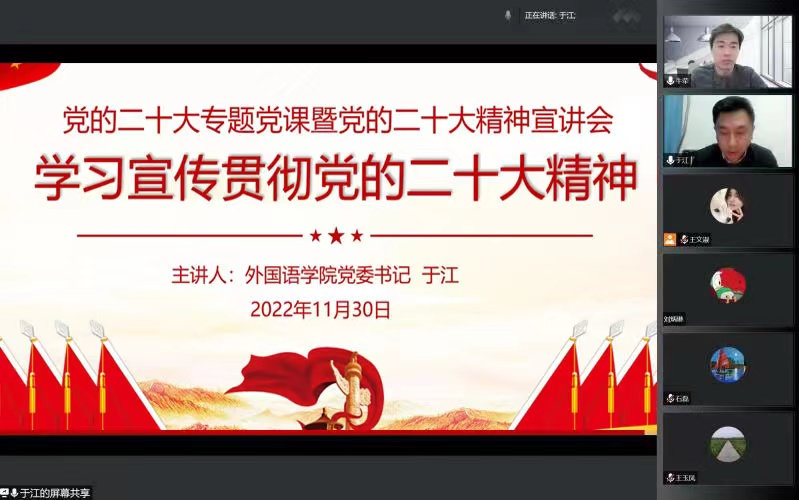 为深入学习宣传贯彻党的二十大精神,迅速在学院掀起学习热潮,11月30日晚,yl6809永利官网集团党委书记于江通过线上线下相结合的方式为学院全体师生党员和入党积极分子共约三百余人上了一堂党的二十大专题党课,并就学院学习贯彻党的二十大精神提出工作要求。