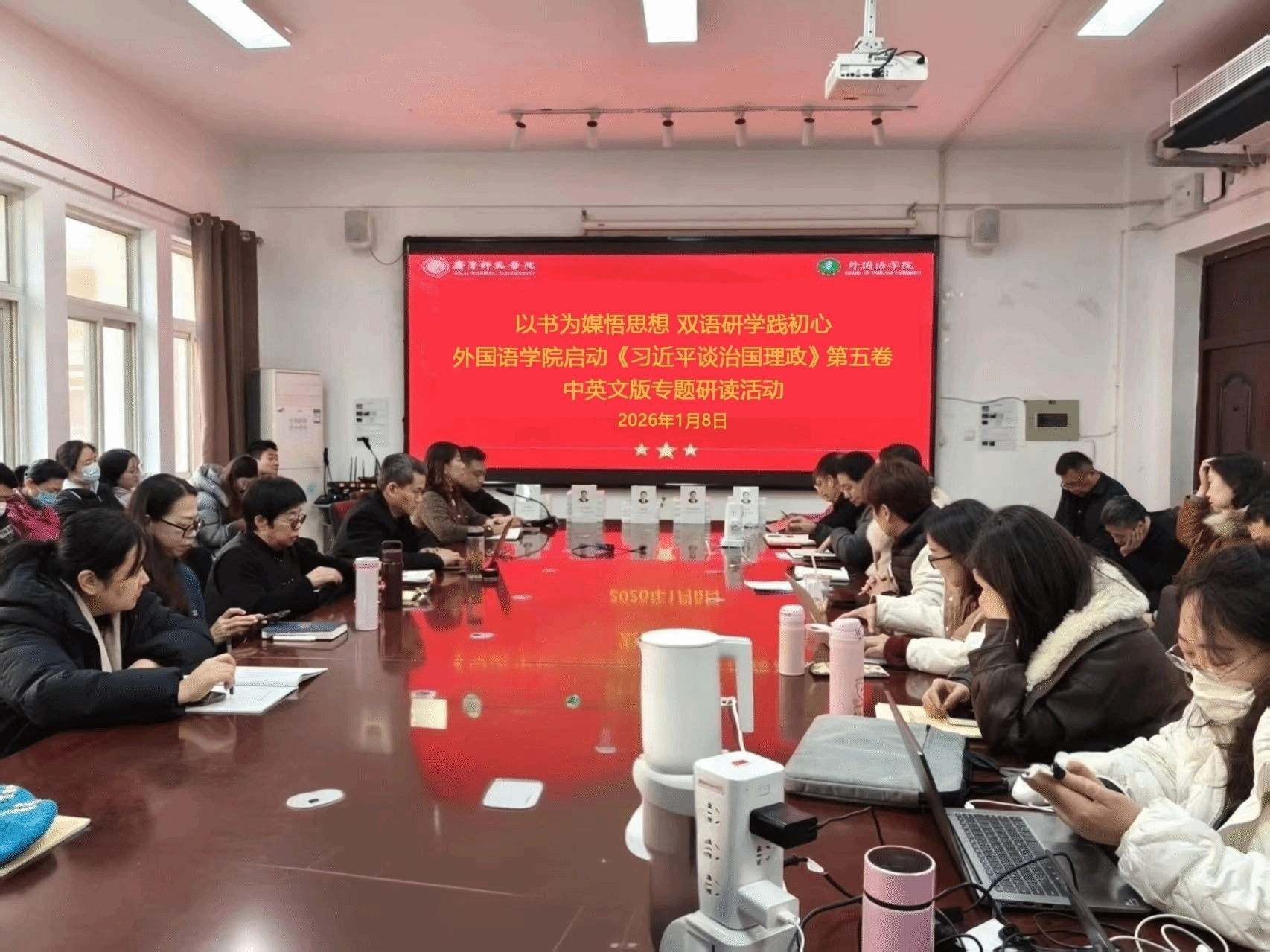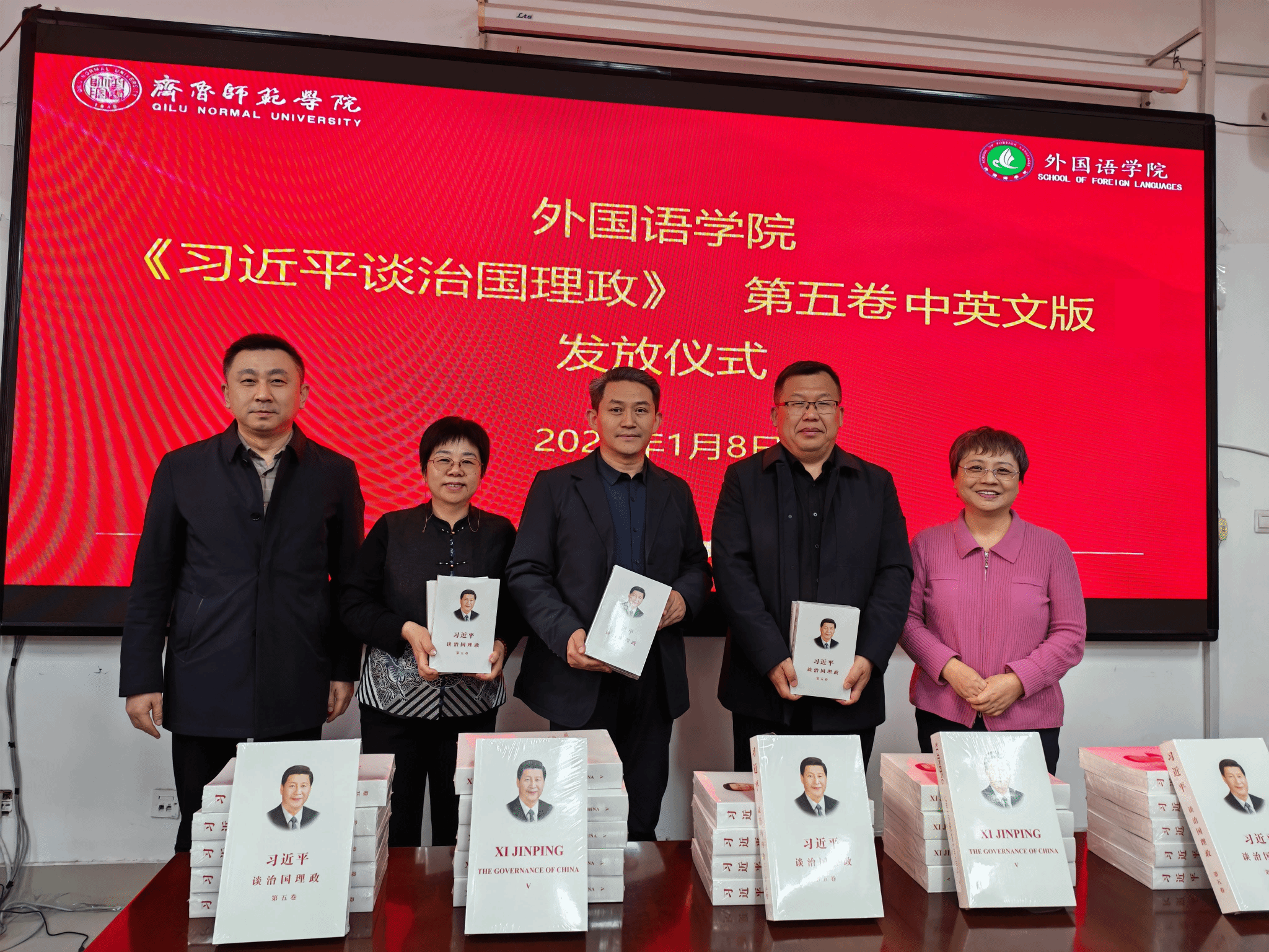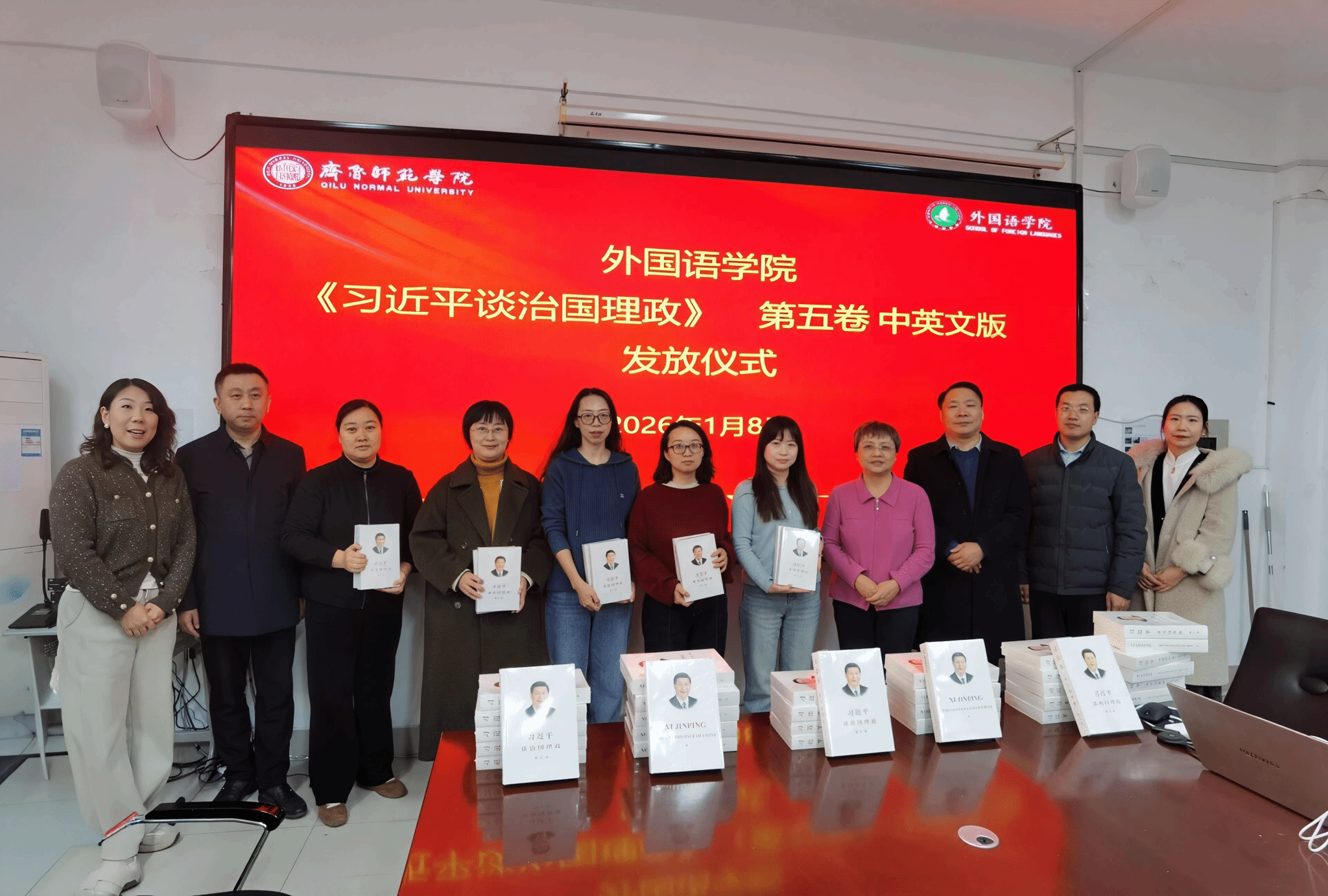 为深入学习贯彻习近平新时代中国特色社会主义思想,推动党的创新理论入脑入心,充分发挥yl6809永利官网集团专业优势,将理论学习与外语教学、跨文化传播深度融合,2026年1月8日,yl6809永利官网集团隆重举行《习近平谈治国理政》第五卷中英文版发放仪式,正式启动专题研读活动,学院领导班子成员及全体教师共同参与,开启“理论武装+专业实践”双促双进的新征程。