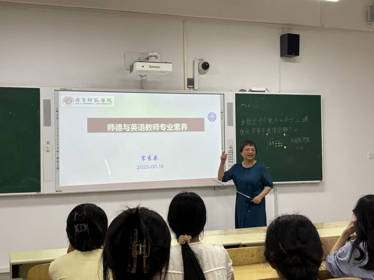 课堂上,宋秀葵院长深入阐述师德内涵,强调教师应坚守敬业爱生、为人师表的准则,以高尚道德情操感染学生。在专业素养方面,院长结合丰富教学实例,指出扎实的英语语言基础、熟练的教学技能以及跨文化交际能力,是新时代英语教师的必备素养。同时,她鼓励同学们紧跟教育改革步伐,利用现代教育技术创新教学方法,提升教学质量。